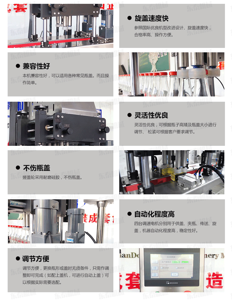 自動旋蓋機原理:電氣控制運動,穩定性強;設有定位裝置,旋蓋標準,操作方便;鎖蓋范圍寬,可鎖不同形狀規格的瓶蓋;解決了噴頭、泵頭、噴霧泵、手扣式噴頭旋蓋難的問題;鎖蓋轉速可調,可根據不同瓶蓋調節松緊度。