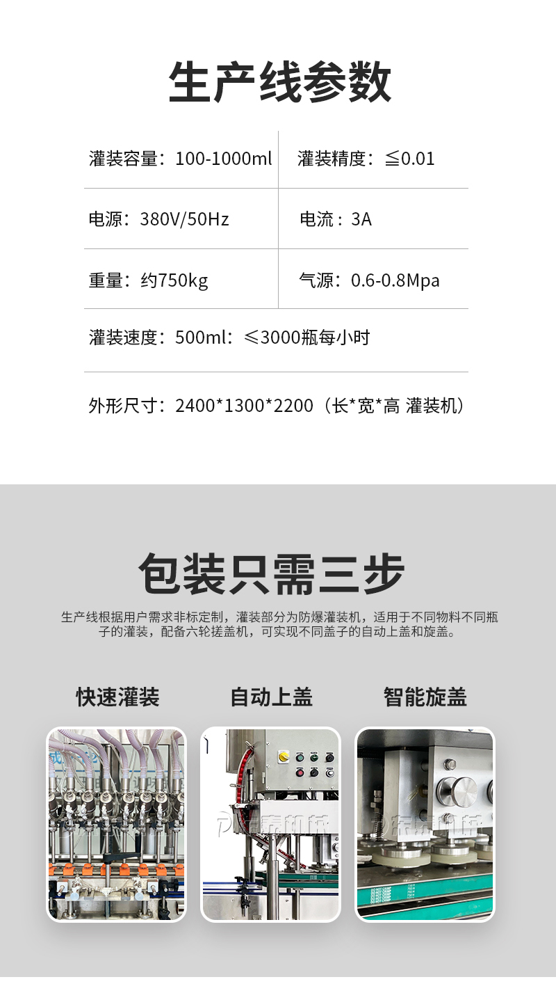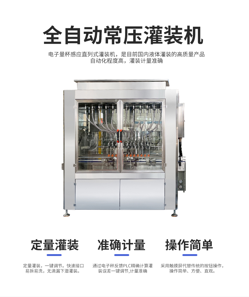 電子量杯感應直列式灌裝機,是目前國內液體灌裝的高端產品,自動化程度高,灌裝計量精確,適用于塑料瓶、玻璃瓶等各種幾何形狀的瓶型的不含氣體的酒水、飲料、調味品及其他溶液的定量灌裝。機器采用觸摸屏代替傳統的按鈕操作,操作簡單、方便、直觀。科技含量高。機器灌裝計量可通過觸摸屏對灌裝時間的調整實現不同計量灌裝,方便操作者使用。