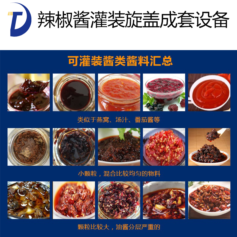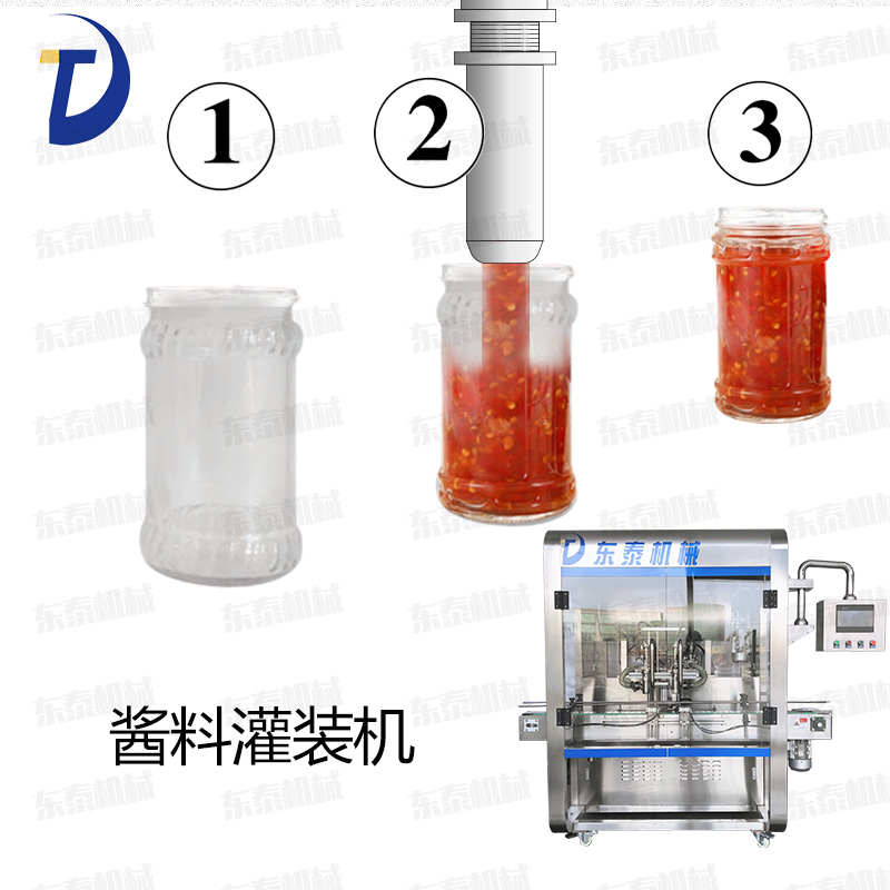 辣椒醬灌裝機(jī)采用活塞式灌裝原理,適用于調(diào)味品中帶顆粒并且濃度較大的辣椒醬、豆瓣醬、花生醬、香菇醬、果醬、牛油火鍋底料、紅油火鍋底料、蝦醬等較為粘稠醬類的灌裝。