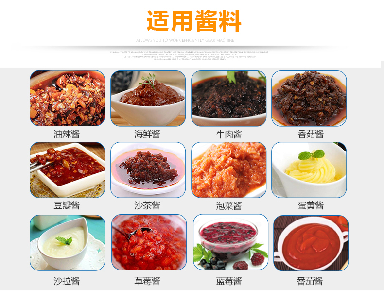 3、 該設備在設計上大大縮短了下料斗到灌裝頭的灌裝距離,克服了含油量大的物料(如:含芝麻粒的辣椒油)在灌裝過程中出現的有些瓶油多,有些瓶醬多的灌裝誤差大的缺點。