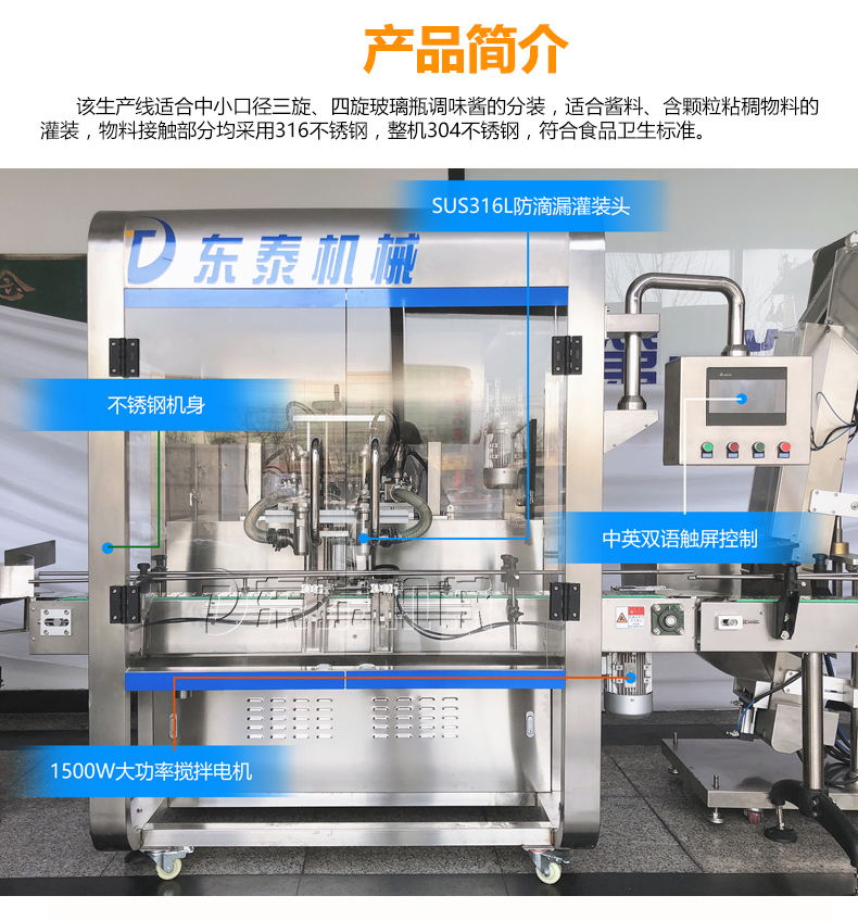 東泰機械通過十多年的努力和發展,現已成為集科研、設計制造、成套供應、技術咨詢服務、工程總承包為一體的高科技型企業。如今專業的東泰技術團隊根據醬料市場研發推出的牛肉醬定量灌裝機設備得到市場的認可和用戶的青睞。同時這款自動化、智能化、效率化、功能化的醬料灌裝機械設備帶領著醬料市場進入規;纳a領域中,為相應企業提供方便、快捷、省時省力的現代化快節奏的發展。如果您有需求,歡迎您到東泰機械實地考察選購!
