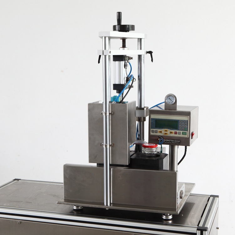 待加蓋的瓶子是手動(dòng)進(jìn)料和手動(dòng)卸載的。在加蓋過程中,瓶子正好放在旋轉(zhuǎn)的蓋帽上方,蓋子上蓋有蓋子。密封頭具有內(nèi)置的垂直運(yùn)動(dòng),其中帶有蓋子的瓶子置于其下方收緊。